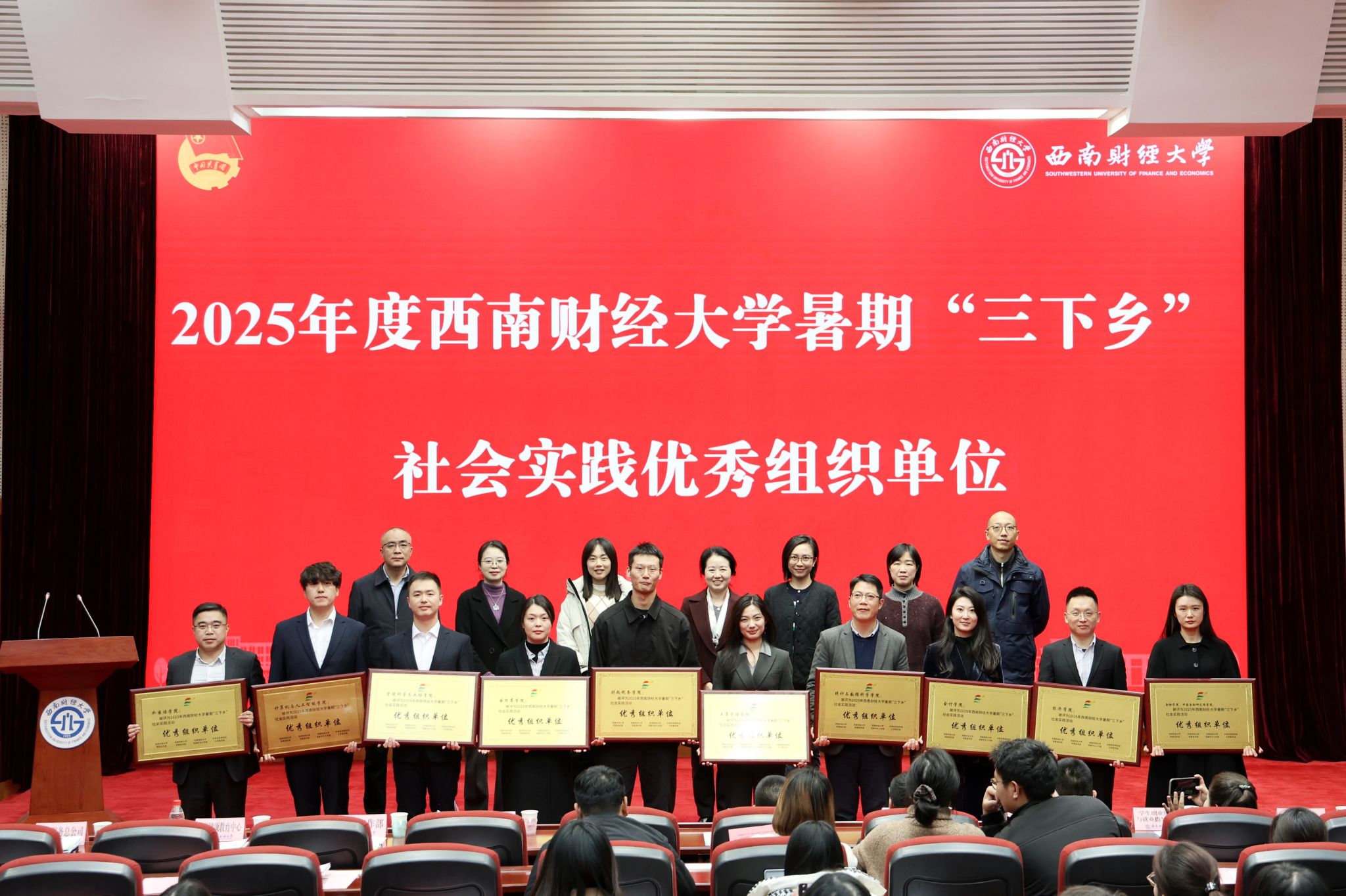 校团委书记谭敏宣读2025年暑期“三下乡”社会实践活动以及2025年度志愿服务先进集体与个人表彰决定。相关部门负责人为获奖集体和个人代表颁奖。