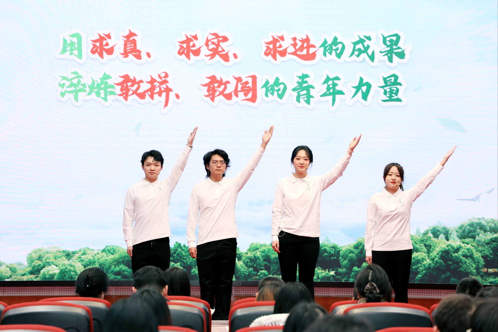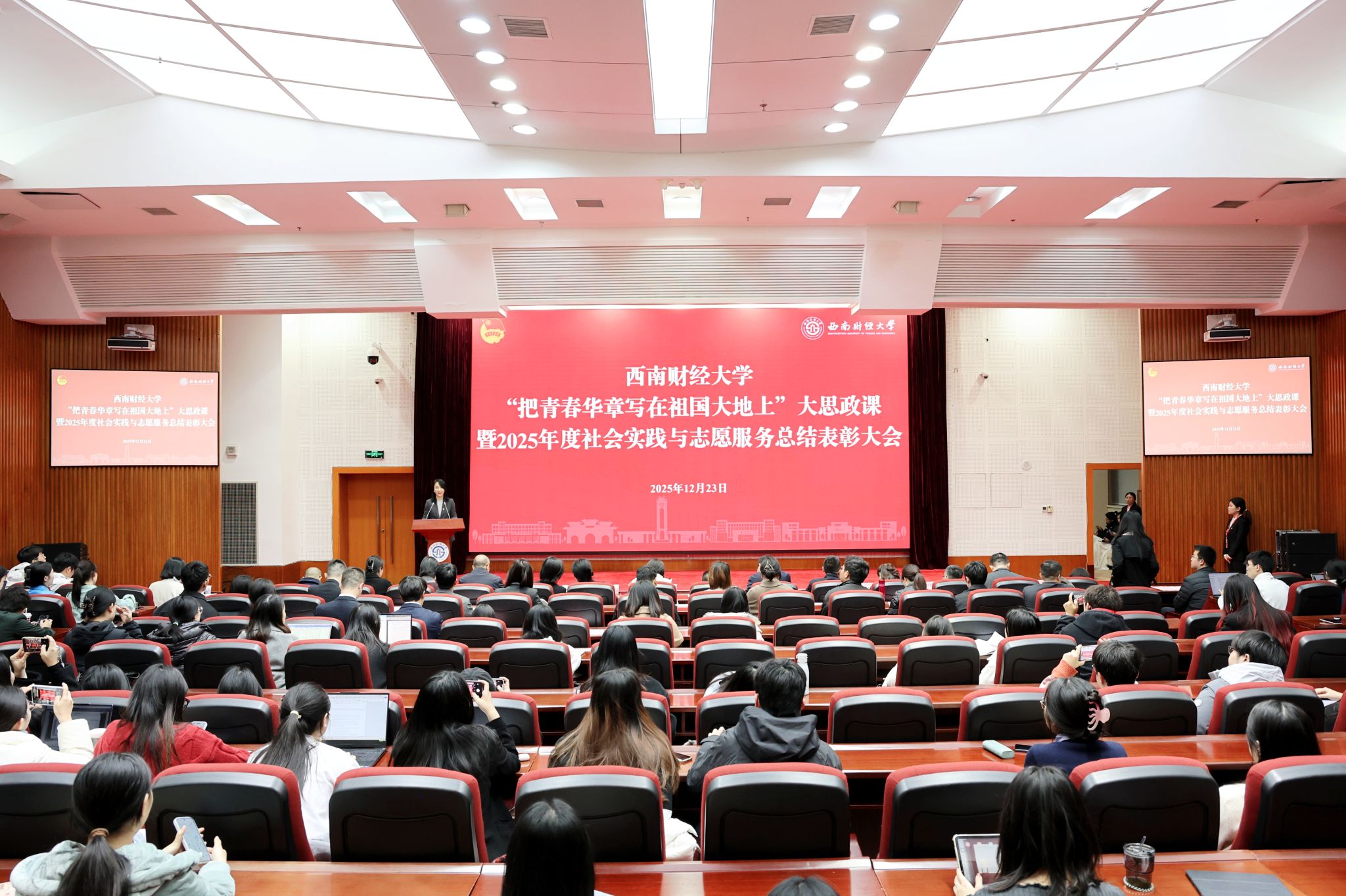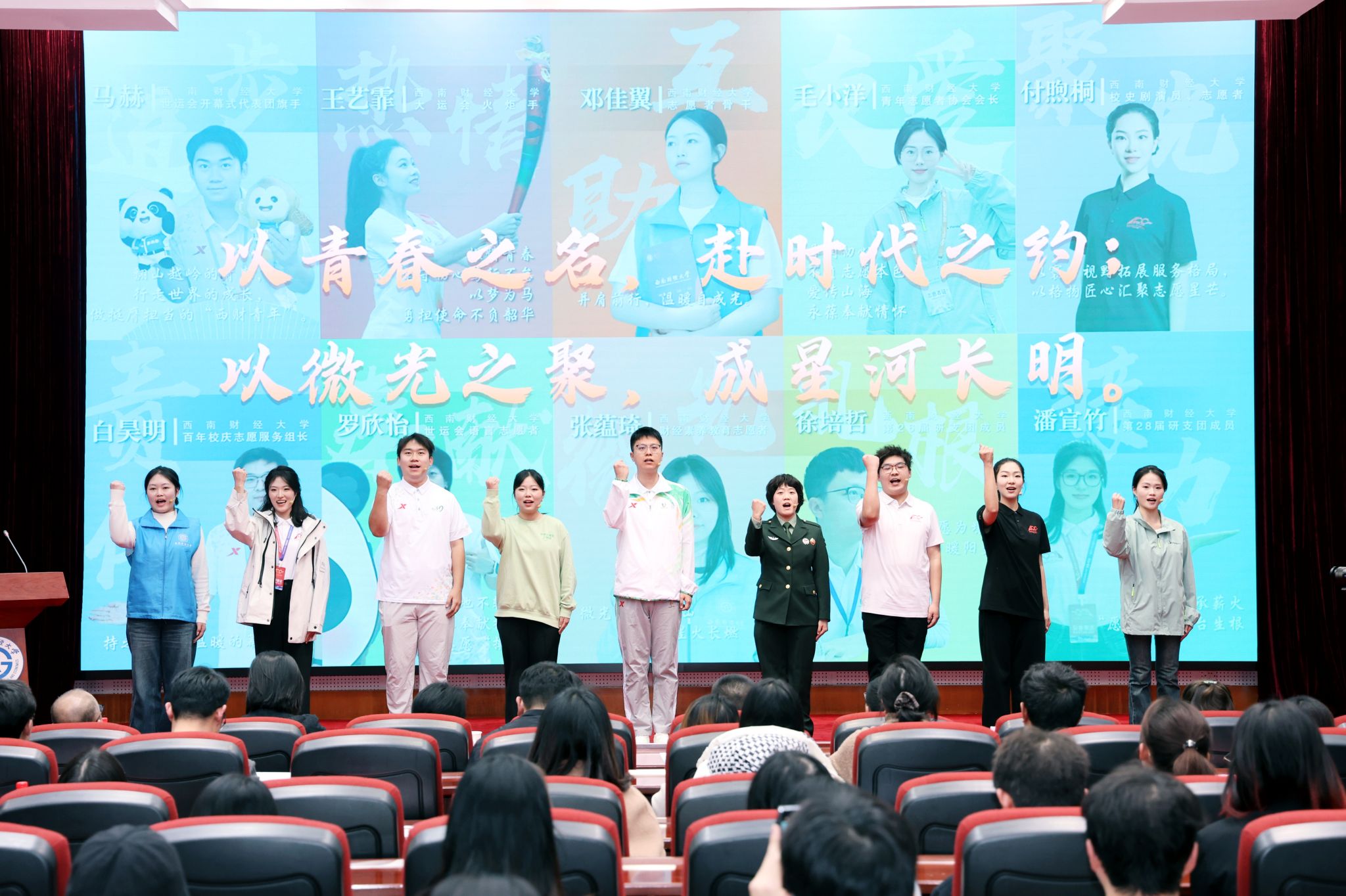 青春主题汇报环节,优秀实践团队代表“西陲行者实践队”分享了深入乡村开展实践的经历与感悟,表达了持续投身社会实践、勇担时代使命的决心。青年志愿服务标兵代表马赫、王艺霏、毛小洋、邓佳翼、付煦桐、白昊明、张蕴琦、罗欣怡、徐培哲、潘宣竹讲述了参与百年校庆、成都世运会等重大活动以及日常志愿服务中的坚守与奉献,充分展现了西财青年的责任担当与昂扬风貌。