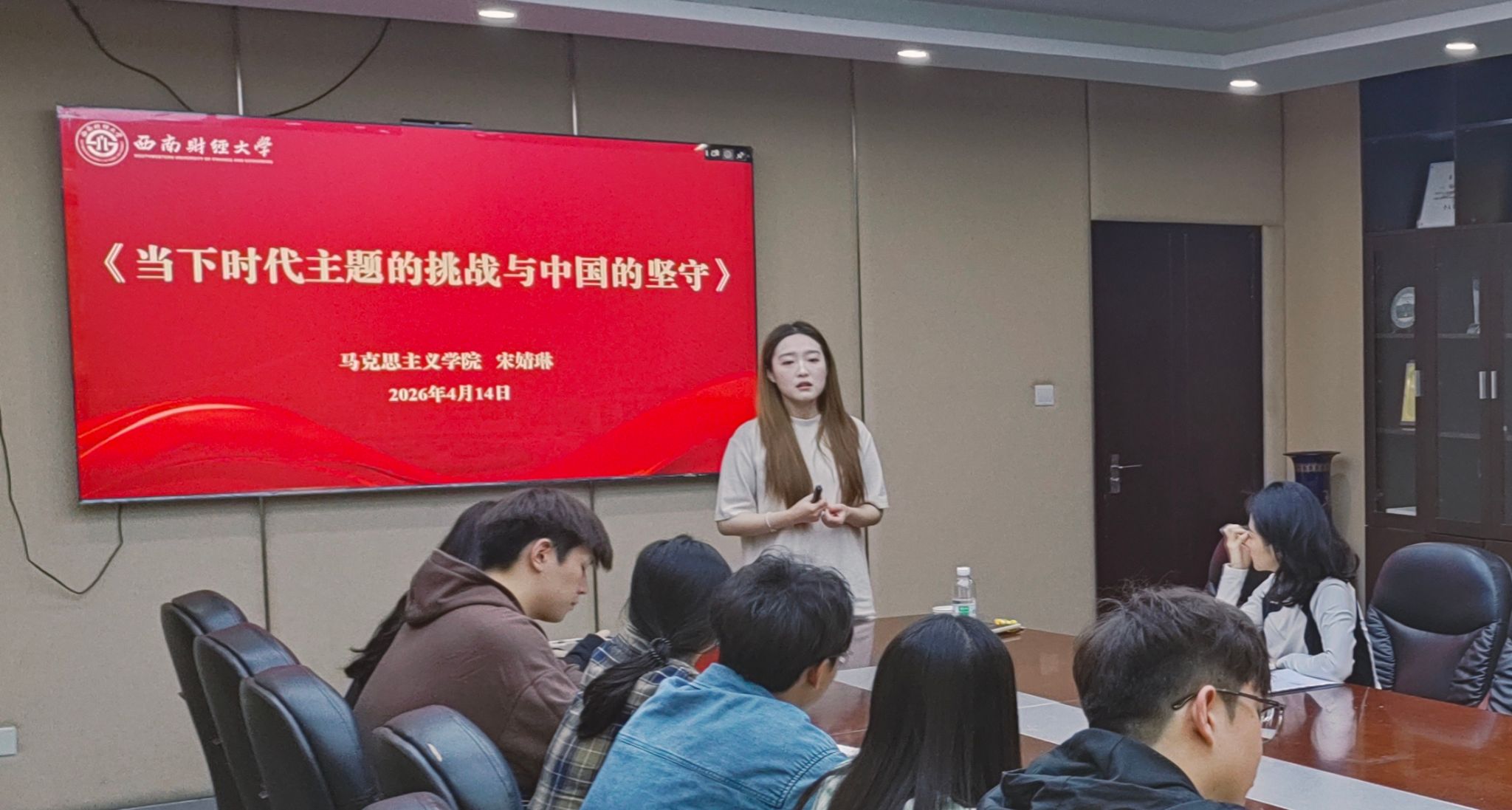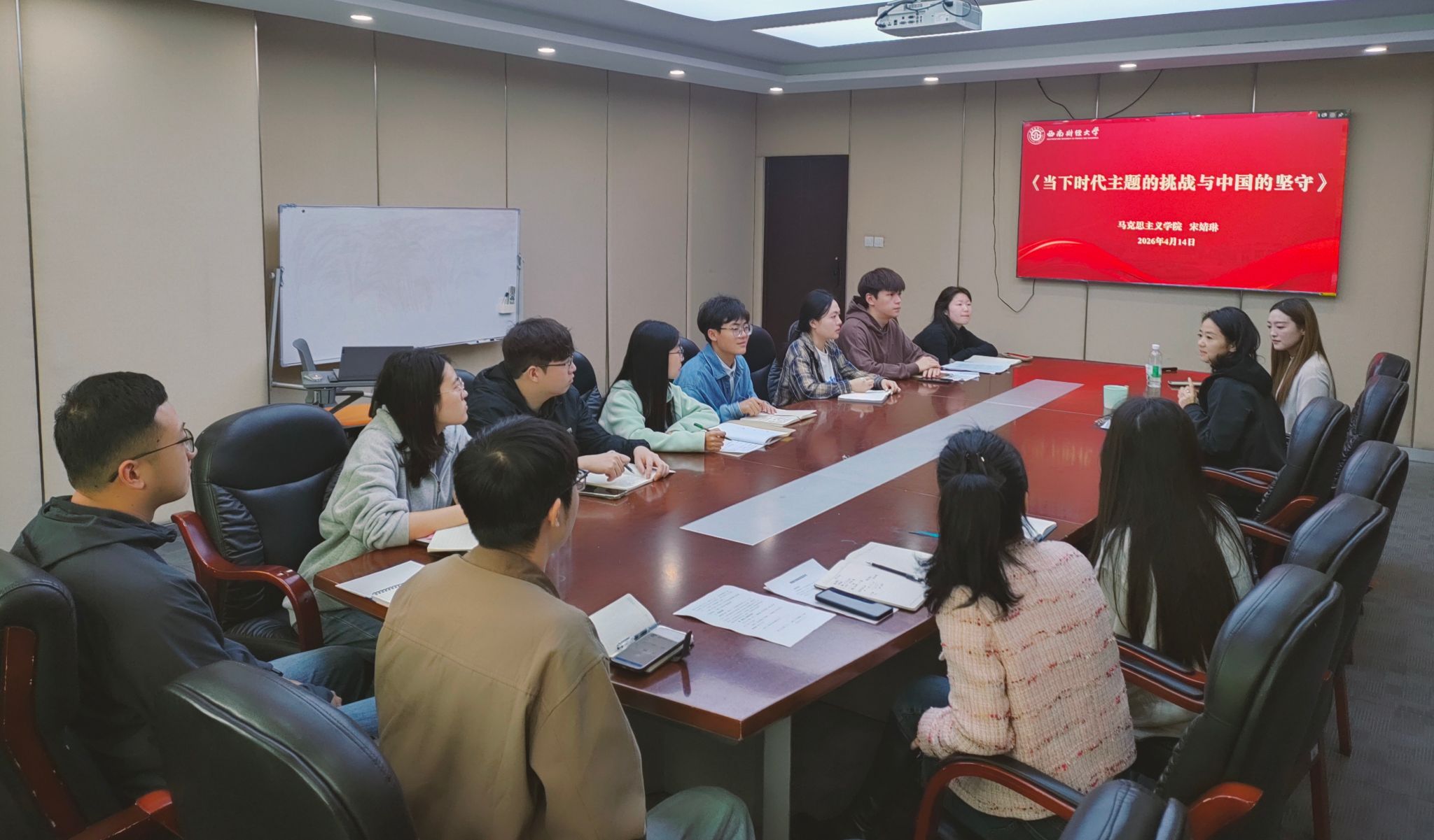 为深入学习贯彻党的二十届四中全会精神,4月14日上午,校团委在柳林校区学生活动中心308会议室组织专题学习会,马克思主义学院副教授宋婧琳应邀作“时代主题的挑战与中国的坚守”的专题分享,校团委党员干部、团员青年骨干代表参加学习。